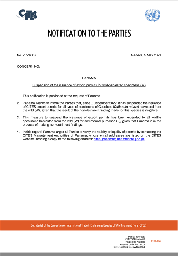 5月5日,濒危野生动植物种国际贸易公约(CITES)组织应巴拿马要求发布本年度第57号缔约方通知:巴拿马当局停止签发“野生微凹黄檀等野外获取的CITES管制物种”的出口许可证。