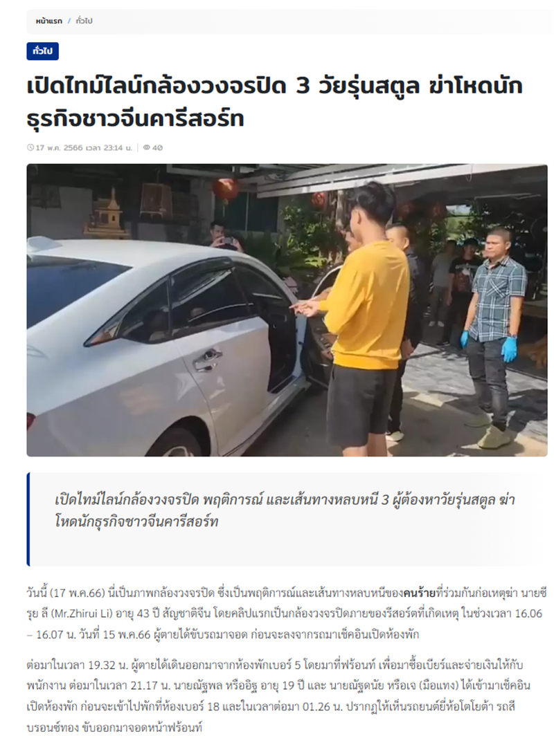 据了解,警方根据死者丢失的车辆进行调查,追踪到凶手开往宋卡府方向,并最终在沙敦府逮捕3名青年。经警方调查,22岁男子Jay、19岁男子It与17岁女子Fai均来自沙敦府拉牛县,3人联手杀害了中国籍大型橡胶木工厂老板李志瑞(音译)。