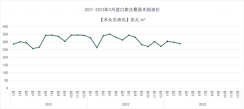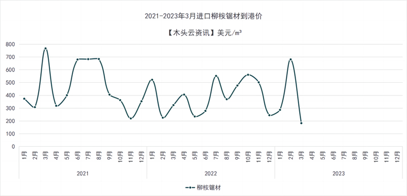 与奥古曼到港价稍显稳定的情况不同,一季度柳桉的到港价格走势波动十分明显。1-3月,柳桉国内到港价达到383.6元每立方,同比增长7.3%。其中,1月至3月每立方的到港价分别为287元、681元以及183元。