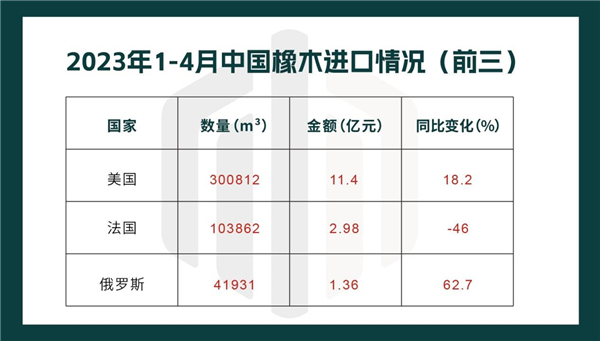 俄罗斯橡木进口量虽然不及美国和法国,只有41931m³,但同比增长率达到了62.7%。