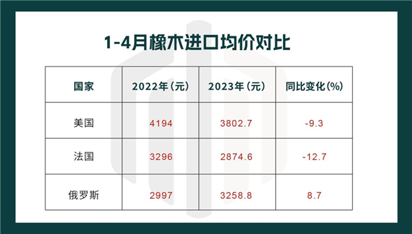 从今年的均价来看,除了俄罗斯之外,美国和法国的橡木均价都分别下降了9.3%、12.7%。