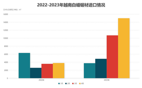 虽然总体出口订单有所下降,但据统计数据显示,今年1-4月,从越南出口至中国的木材及木制品同比增长了85.7%,白蜡木锯材占比仍排名第一,同比上涨110%,共计34219m³,并且从趋势上看,出口至中国的越南木材及木制品还有上涨空间。