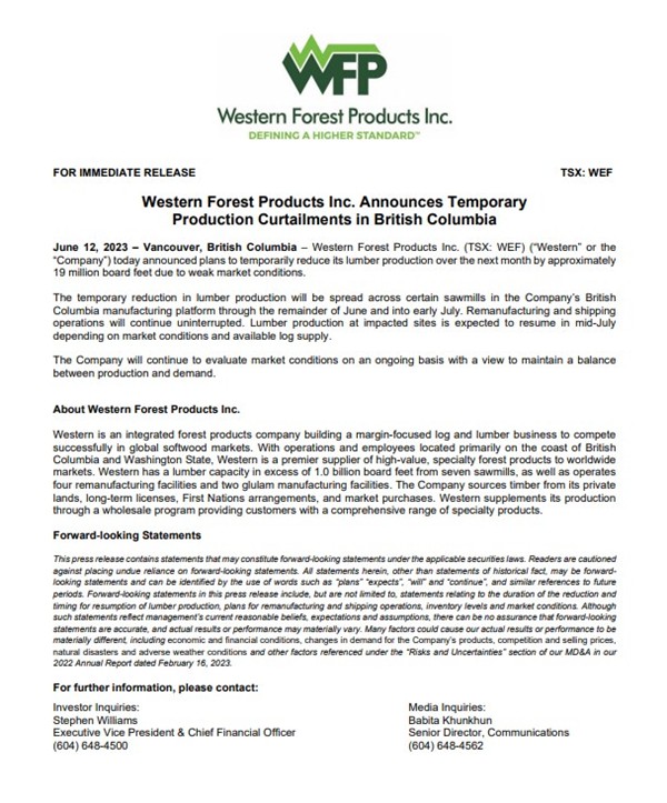6月12日,加拿大西部林产品公司(western forest products,也译作西弗雷泽,以下简称WFP)宣布,将在6至7月暂时降低木材生产水平。同时,已确认计划在下个月暂时减少约1900万板英尺的木材产量。