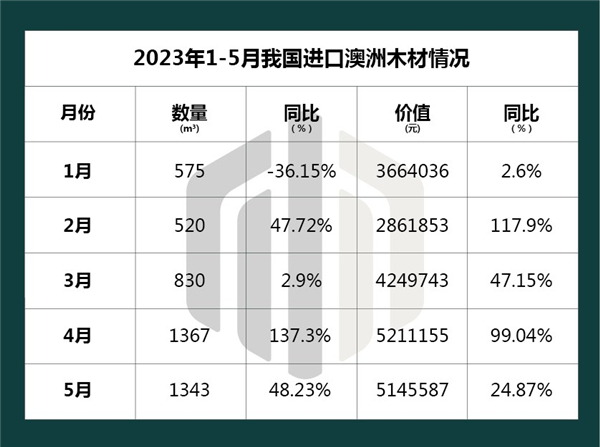 2023年前五个月,我国进口澳大利亚的锯材数量达到4635立方米,与2022年的3585立方米相比,同比增长29.3%。与2022年1-5月1451万元的进口价值相比,2023年同一时期的澳洲锯材进口价值为2053万元,同比增长41.5%。