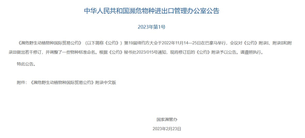 在2022年11月举办的第十九届CITES缔约方大会上,最终确定了将非洲所有紫檀属和缅茄属及卡雅楝属收录进《濒危野生动植物种国际贸易公约》附录II(以下简称“附录II”)。在2023年2月,国家濒管办正式将修订后的《公约》附录予以公告。