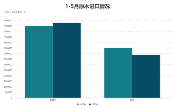 随着俄罗斯、澳大利亚、加拿大和美国的原木供应在过去五年中大幅下降,新西兰和欧洲已成为供应中国原木的两个主要地区。数据统计显示,今年1-5月,新西兰原木占比41.7%,同比增加4%,共计687万m³;欧洲原木占23%,同比下降14%,共计386万m³。