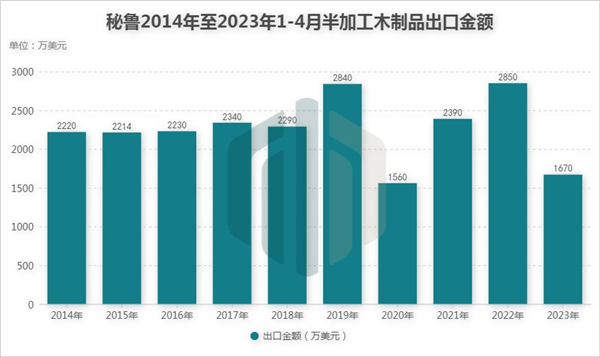通过对比秘鲁2014年至2023年1-4月的半加工木制品的出口金额,整体上看,除了2020年全球对木制品的需求因疫情蔓延而受到影响,在2021年至2022年期间,秘鲁的半加工木制品出货量相对来说恢复了往年水平,且在2022年更是达到十年来最高水平。
