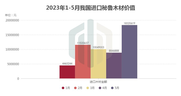 回看今年前五个月,我国进口秘鲁的木材相对2022年也有所减少。2023年1-5月,我国进口秘鲁木材总额达到11147立方米,同比下降29.6%;金额达到5321万元,同比下降42.18%。而在2022年同一时期,我国进口秘鲁木材达到15835立方米,进口价值达到9203万元。