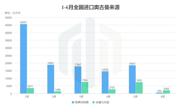 然而,情况在今年6月出现转变。6月,刚果共和国(刚果-布)对我国的奥古曼出口数量仅仅只有554立方米,继而导致6月全国奥古曼进口数量暴跌。