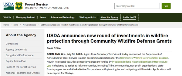 近日,美国农业部宣布通过社区野火防御拨款对野火保护进行新一轮投资。在前一轮投资中,22个州和7个部落的99个项目提案共获得了1.97亿美元。涉及到2000万英亩的国家森林和草原,以及3000万英亩的其他联邦、州、部落和私人土地,以降低社区、基础设施和自然资源的野火风险。