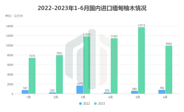 2023年1-6月,缅甸出口到我国的柚木总量达62192立方米,对比去年同期上涨了1345%;进口总值达3亿7784万元,同比增长1146%。其中,柚木锯材数量达到60340立方米,同比大幅增长2677%。