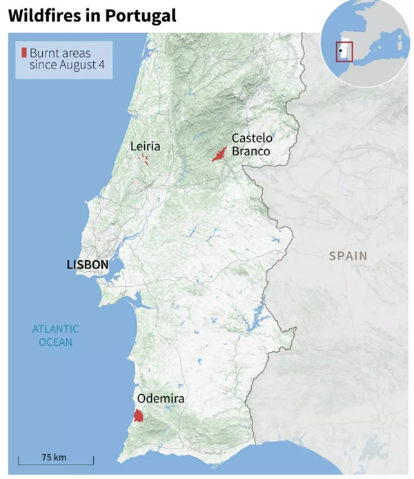 在热风叠加酷热天气的作用下,葡萄牙的15000公顷(约3.7万英亩)树木被烧毁。据悉,最大的火灾发生在南部的奥德米拉地区,并蔓延至阿尔加维。由于该地区是葡萄牙受众非常高的旅游胜地,野火导致了1500多人被紧急疏散。