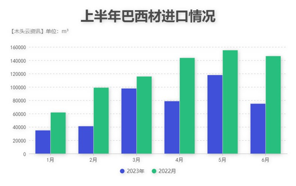 据统计数据显示,今年上半年,来自巴西的进口材数量同比下降38.3%,共计44.4万m³;价值总额同比下降35.7%,共计4.6亿元。其中6月的跌幅最大,与上个月相比下降了36.5%,共计74795m³。