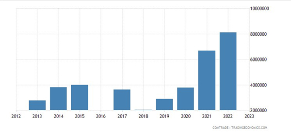 2022年,摩洛哥对华贸易差额达到了-257亿MAD(摩洛哥货币迪拉姆),根据联合国商品贸易统计数据库数据显示,中国胶合板的进口数量仍在大幅攀升。