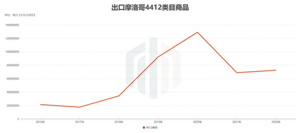 胶合板、胶合板和类似的层压木材达到810万美元。而根据小懒查询中国海关数据显示,2022年,4412类别(胶合板、单板饰面板及类似的多层板)对摩洛哥出口商品的数额也达到了1077万美元。