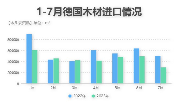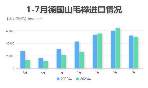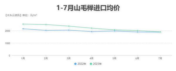 从进口均价走势来看,虽然今年以来德国山毛榉的价格在去年水平之上,但7个月以来一直呈下跌趋势发展,并且7月的价格已经接近于2022年同期水平。