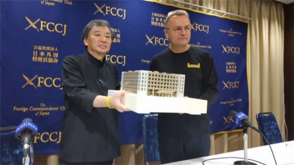 建筑师Shigeru Ban(左)和利沃夫市长Andriy Sadovyy在东京举行的新闻发布会上拿着Shigeru Ban为乌克兰城市设计的医院建筑模型。