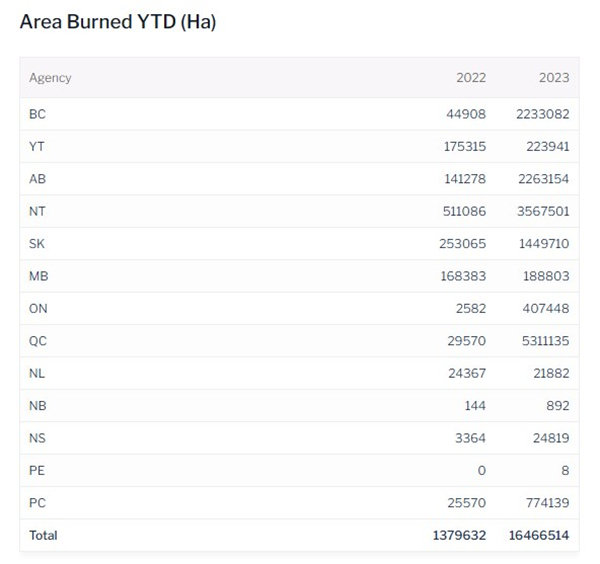 截至9月6日的加拿大各省过火面积