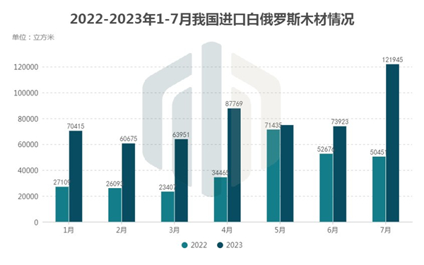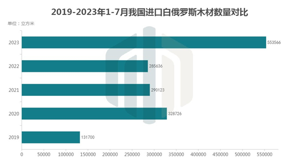 根据我国海关2019年至2023年1-7月的进口数据,2023年前7个月自白俄罗斯进口的木材数量大幅增长,在这五年的1-7月期间遥遥领先。
