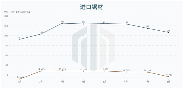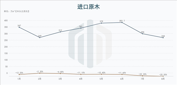 进口原木同样在8月达到今年最大跌幅:-25.5%,至268万立方米,进口额下降33.1%至33.4亿元。