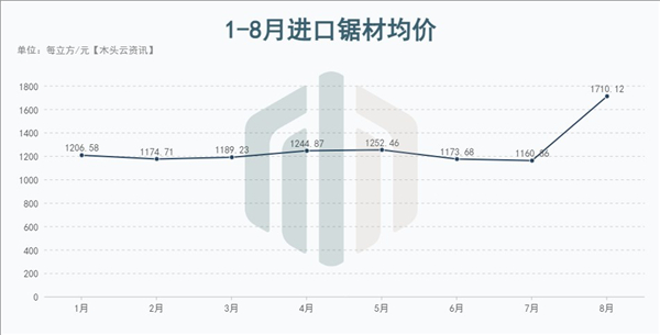 与此同时,从锯材均价来看,在7月份跌落至本年最低均价的1161元后,8月的木材进口均价升至每立方1710元。