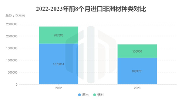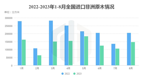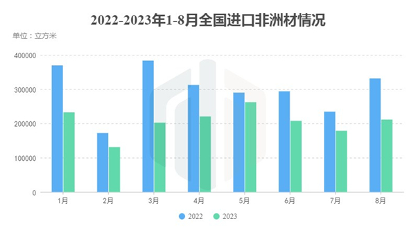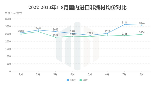 与此同时,从均价来看,对比7月,8月进口的非洲材均价稍有上涨,但对比2022年同期,每立方仍然有着622元的落差。