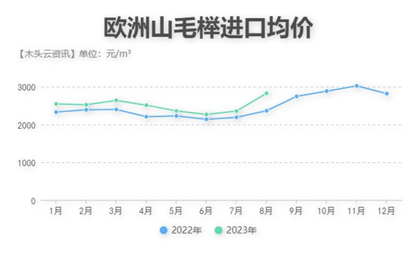 自今年3月起,欧洲山毛榉的进口均价就开始下跌,直到下半年开始才止住跌势重新上涨。从整体上看,今年欧洲山毛榉的的价格都高于去年,且变化趋势基本一致,预测在未来的上个月里,欧洲山毛榉的价格还会持续上涨至3000元/m³左右。