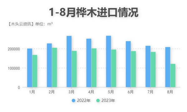 据中国海关总署的统计数据显示,1-8月欧洲材进口同比下降8.9%,共计1836万m³;其中8月欧洲材环比下降17.2%,同比下降34.2%,共计173万m³。