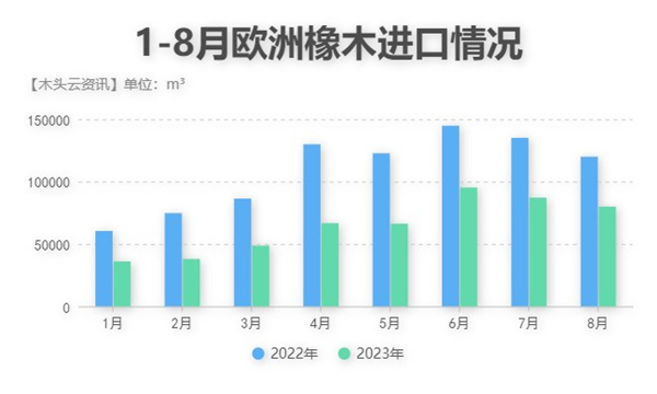 今年以来,欧洲橡木的进口数量都不如去年,8月欧洲橡木进口共计79940m³,环比下降8%,同比下降33%。并且在下半年开始,欧洲橡木的进口量还在逐渐下降,预计在年底,欧洲对华的橡木出口量会恢复至年初水平。