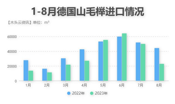 8月来自欧洲山毛榉共进口了63214m³,环比下降41.4%。其中,德国山毛榉的占比也从46%下降至36%,共计22844m³,同比下降了48.4%,是今年以来最大降幅。