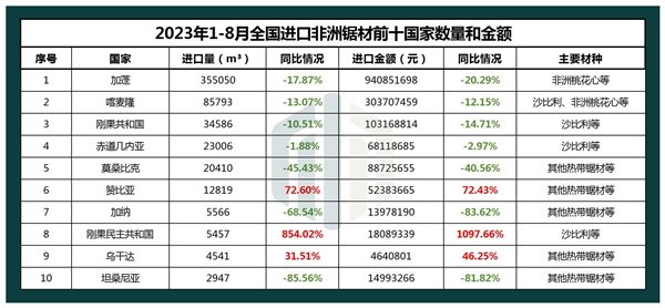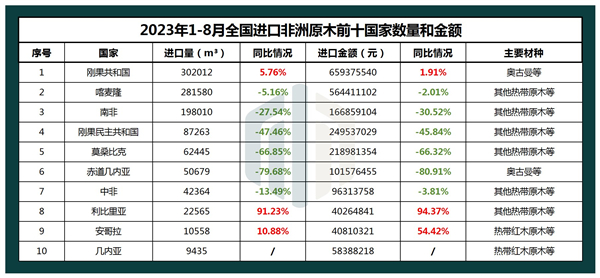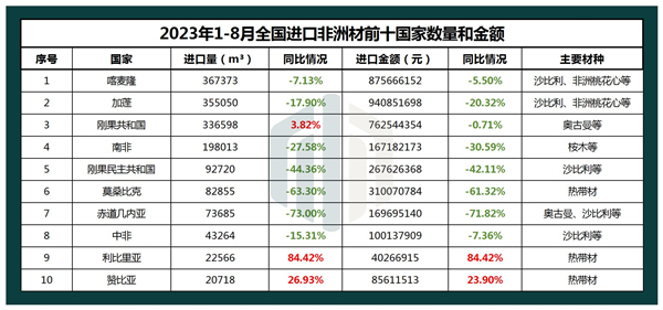 其中,今年1-8月出口到我国的非洲木材前十大国家分别为喀麦隆、加蓬、刚果共和国、南非、刚果民主共和国、莫桑比克、赤道几内亚、中非、利比里亚以及赞比亚。