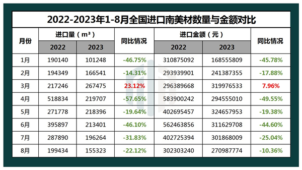 根据海关公开的数据,今年以来,随着国内市场对南美材需求疲软,全国范围内进口的南美材数量明显下降。尤其是,自3月以来,进口情况呈现出逐步下降趋势。