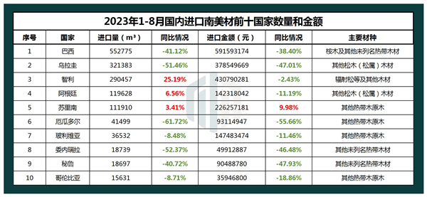 对我国南美材出口前十的国家分别是巴西、乌拉圭、智利、阿根廷、苏里南以及厄瓜多尔等国家。其中,智利、阿根廷以及苏里南对我国的出口保持稳定增长,而厄瓜多尔、委内瑞拉以及乌拉圭等国家,出口下滑幅度超50%以上。