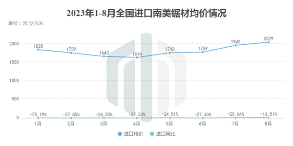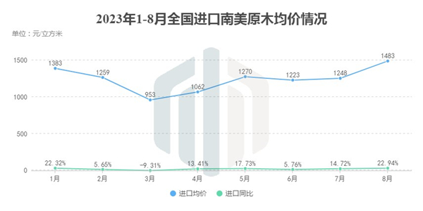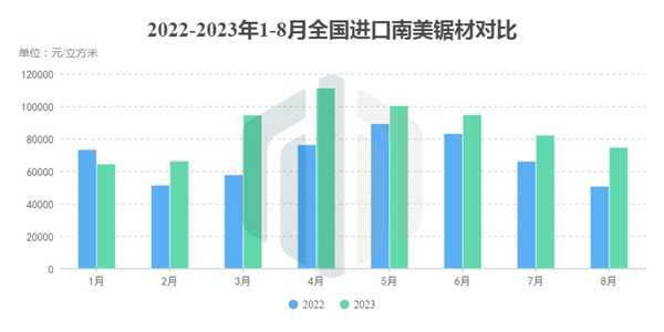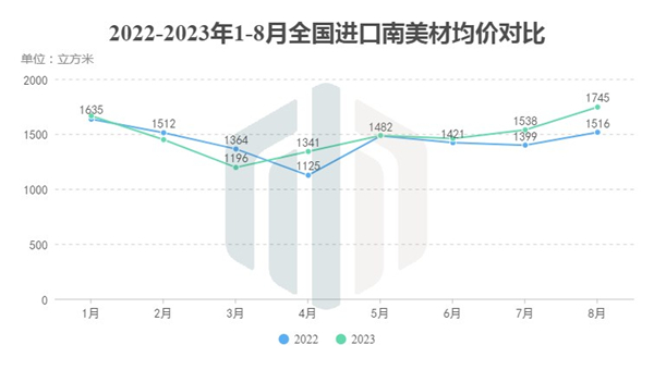 从均价上看,2023年的南美材进口均价整体比2022年同期略高。尤其是在8月,尽管该月份系截至目前进口数量低位排名第二,但并不影响其成为今年以来均价水平最高的月份,达到1745元/立方,同比增长15.95%。
