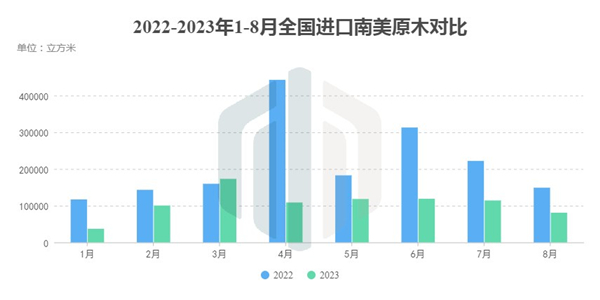 通过与去年1-8月国内进口南美材对比,就单个月份而言,4月成为全年截至目前进口量下滑最为明显的月份,降幅达到57.65%。