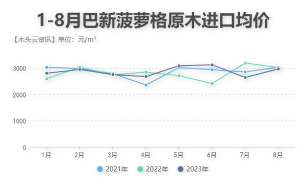 除此之外,在经历了7月的价格大跳水后,巴新菠萝格原木的进口价格在8月稍有上涨,接近往年同期水平。综合今年的价格走势和市场情况分析,第四季度菠萝格原木的进口价格或保持在3000元/m³左右。