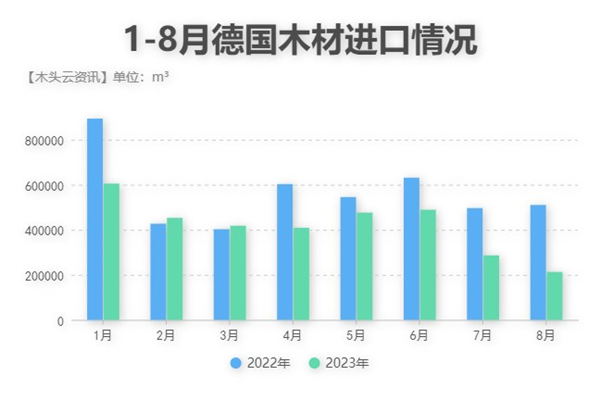而在今年8月,德国对中国的木材出口还在不断创下新低记录,仅有21.2万m³。目前德国本土采伐业还没有恢复至年初水平,预计在2023第四季度,德国还对中国市场保持低量出口。