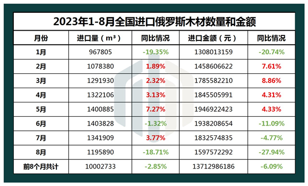 从整体上看,今年前8个月,俄罗斯对我国的木材出口量达到1000万立方米,占其出口总量的60%以上。与此同时,我国的进口木材中,来自俄罗斯的木材占比接近进口总量的四分之一。