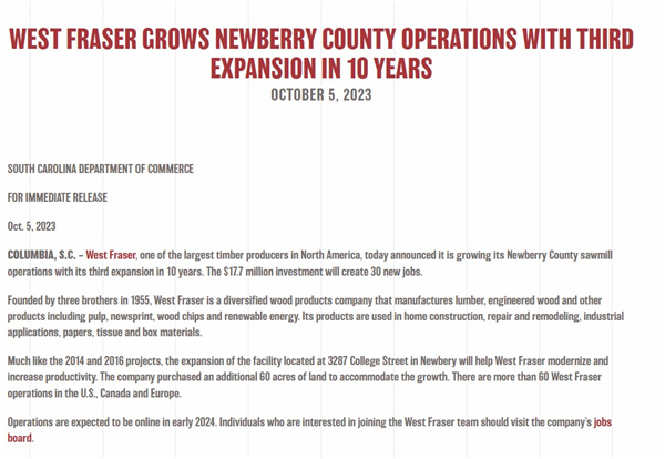 在公告发布后,商务部长哈里·莱特西三世也对West Fraser表示祝贺,“这将进一步加强南卡罗来纳州蓬勃发展的农业综合企业产业。期待贵公司能与纽伯里县继续保持友好的合作伙伴关系。”