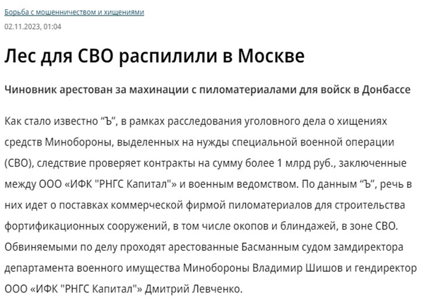 根据《生意人报》报道,莫斯科一家法院以大型欺诈罪逮捕了俄罗斯国防部军事财产司副司长弗拉基米尔·希绍夫和木材公司“IFK RNGS Capital”的首席执行官德米特里·列夫琴科。