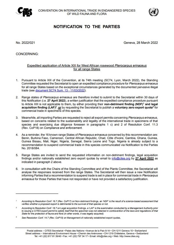 实际上,自2022年3月以来,喀麦隆、中非共和国、乍得、冈比亚、几内亚比绍、马里、多哥这七个刺猬紫檀分布国的样本商业贸易(包括出口、再出口和进口)已被即刻被停止。