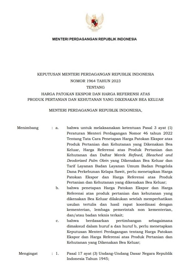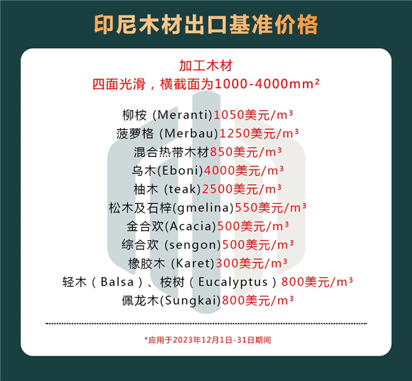 近日,印尼贸易部发布了2023年12月适用的木制品出口基准价格(HPE)。