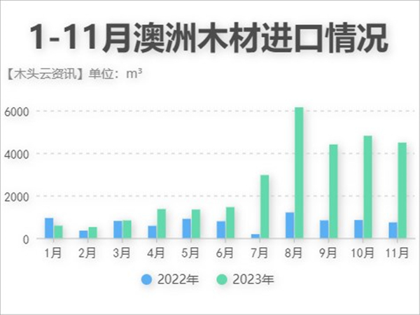 今年上半年,澳大利亚向中国出口的木材数量同比增长了39%,共计6100m³。下半年起,澳大利亚向中国出口的木材数量增长更加明显,其中仅在8月就达到6149m³,之后的月份也基本保持在4000m³左右。