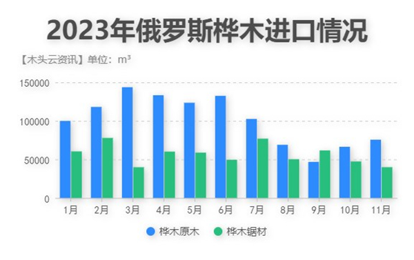 从木材种类来看,今年进口的俄罗斯木材大多是松杉木、桦木、杨木和橡木等。自9月起,俄罗斯向中国出口的桦木原木的数量就在不断增加,在11月其数量比锯材还多出近一倍,环比增长13.6%。