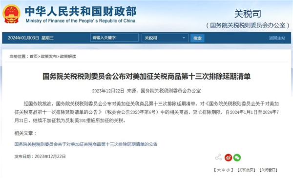 根据《国务院关税税则委员会关于对美加征关税商品第十一次排除延期清单的公告》(税委会公告2023年第6号),对美加征关税商品第十一次排除延期清单于2023年12月31日到期。国务院关税税则委员会按程序决定,对相关商品延长排除期限。