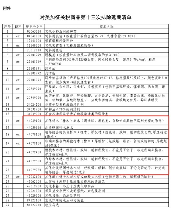 其中,根据国务院关税税则委公布的对美加征关税商品第十三次排除延期清单,包含税则号列为“44039100”的橡木原木、“44039960”北美硬阔叶木原木等,继续不加征我为反制美301措施所加征的关税,期限为自2024年1月1日至2024年7月31日。