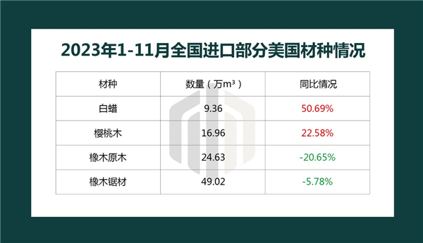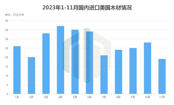 我国海关最新统计数据显示,2023年前11个月,自美国进口的木材总量达306万立方米,同比增长2.3%;进口金额达96亿元,同比下降4个百分点。