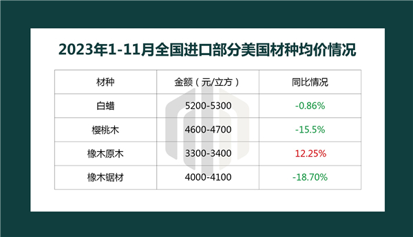 从到港平均价格来看,前11个月的进口情况中,橡木锯材均价下降幅度较大,达到18.69%至4000-4100元/立方;橡木原木每立方的平均价格在3300-3400元/立方,较去年同期增长400元左右;樱桃木均价下降幅度达到15.5%至4600-4700元/立方;而白蜡木的平均价格则略微低于去年同期。
