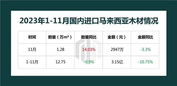值得注意的是,自下半年开始,全国进口马来西亚木材数量猛增。近7-11月这5个月份,进口自马来西亚的木材总量达7.7万立方米,较上半年增长53%。与此同时,2023年下半年较去年同期增长44.1%。