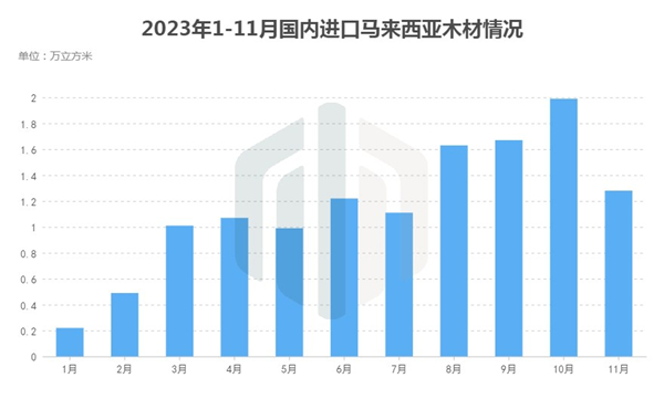 根据木头云整理的海关数据,2023年前11个月,国内自马来西亚进口的木材累计总量达到12.75万立方米,对比2022年同期仅小幅下降0.9%;贸易额累计达到3.15亿元,同比下降10.75%。其中,11月我国与马来西亚的木材贸易继续保持增长。